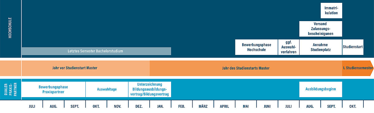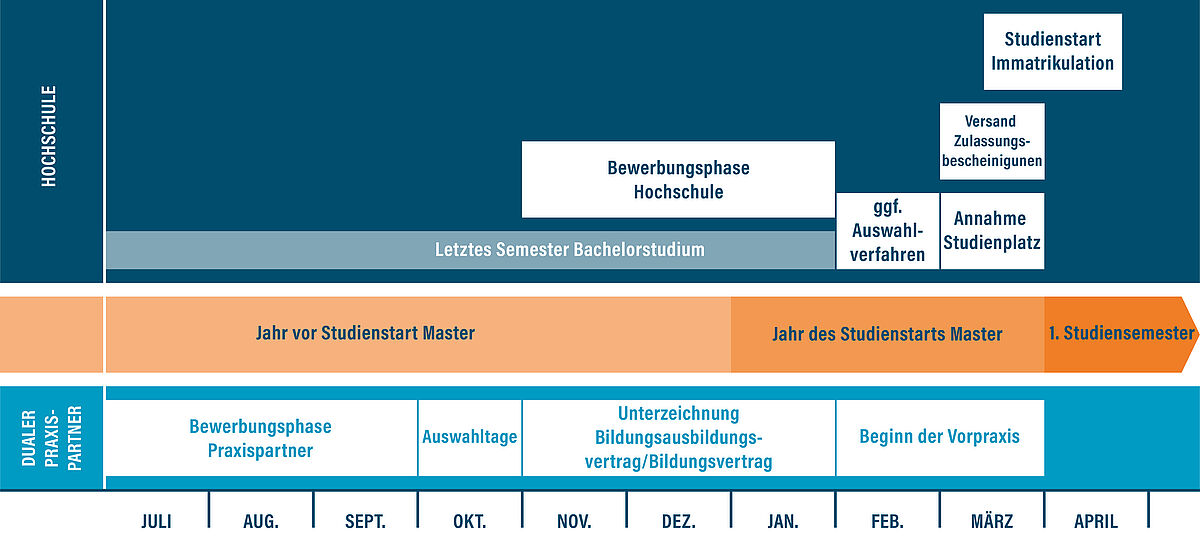 Anschließend bewerben Sie sich an der Hochschule für einen Studienplatz. Für das duale Masterstudium gelten die regulären Zugangs- und Zulassungsbedingungen (einschließlich NC oder Eignungstests) des regulären Masterstudiengangs der Hochschule. Die Hochschulen geben auf ihrer Homepage rechtzeitig vor den Bewerbungszeiträumen die einzureichenden Unterlagen bekannt. Auch der Vertrag mit dem Praxispartner muss eingereicht werden. Je nach Hochschule ist ein Beginn des Studiums im Wintersemester und/oder Sommersemester möglich. Viele der dualen Masterstudienangebote können auch in Teilzeit studiert werden.